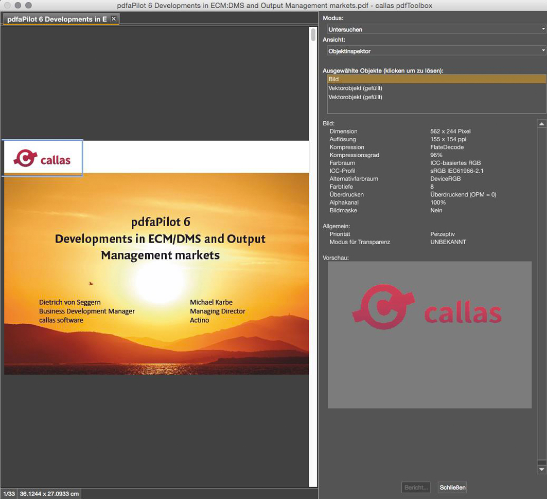 pdfaPilot unterstützt dabei sämtliche Normteile des ISO-Standards für die Langzeitarchivierung, so auch PDF/A-3. Mit diesem können Anwender die PDF/A-konformen Dateien gemeinsam mit den Quelldokumenten zusammenhängend ablegen. Diese Option einer hybriden Archivierung hat sich callas zunutze gemacht und präsentiert während der CeBIT, wie Unternehmen ihre Akten bzw. ihre E-Mails systemunabhängig mit dem pdfaPilot aufbewahren können. Die Bestandteile einer PDF/A-3-Datei fasst pdfaPilot auf einer individuell anpassbaren Übersichtsseite komfortabel zusammen. Neben der langzeitstabilen Archivierung und der zusammenhängenden Aufbewahrung von Quell- und PDF/A-Datei gehört die robuste, eindeutige Darstellung in Form der PDF-Datei zu den Vorteilen. Denn damit ist ein zweifelsfreier Austausch mit mehreren Beteiligten gewährleistet.