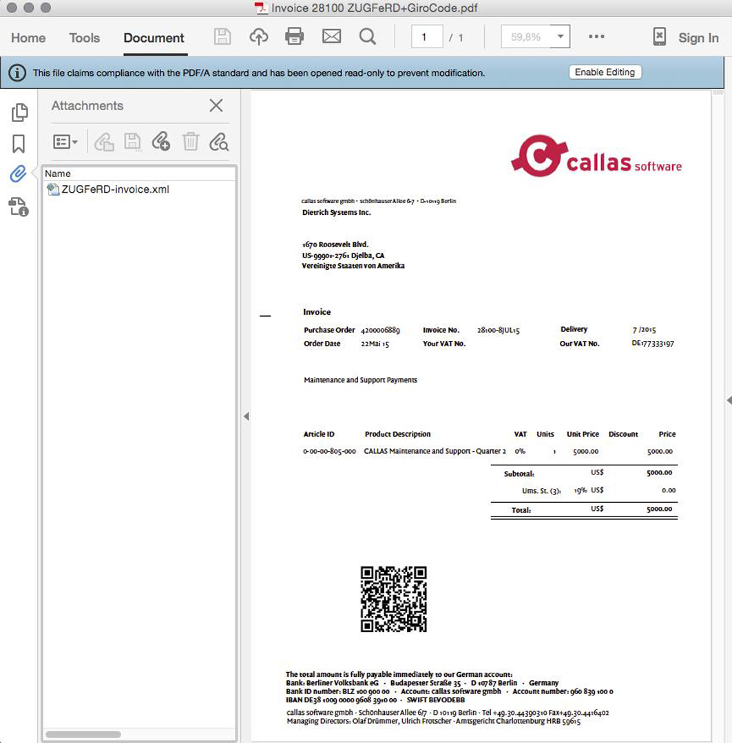 PDF/A-3 ist auch das Trägerformat für das ZUGFeRD-Datenmodell. Die auf diesem Datenformat basierenden elektronischen Rechnungen beinhalten in einer Datei ein archivierbares PDF/A-Dokument und einen maschinell nutzbaren XML-Datensatz. Mit pdfaPilot können Anwender diese Dateien erstellen, prüfen und verarbeiten. Lieferanten sind darüber hinaus in der Lage, ihre ZUGFeRD-konformen Rechnungen optional mit einem GiroCode zu versehen. Dabei handelt es sich um einen QR-Code, in dem alle zahlungsrelevanten Daten, also Empfänger, IBAN, BIC, Betrag und Verwendungszweck enthalten sind.
