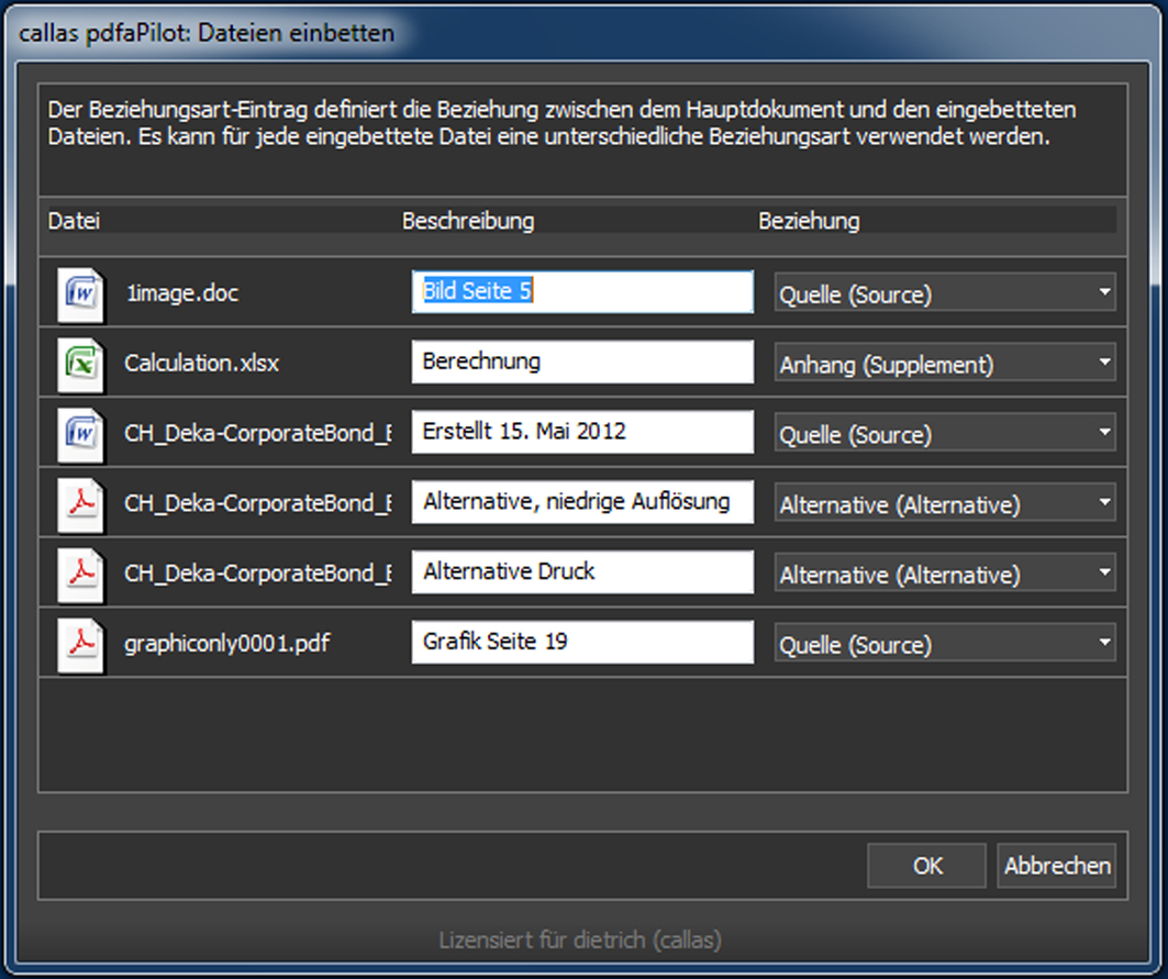 Der callas pdfaPilot zählt weltweit zu den renommiertesten PDF/A-Produkten. Er basiert auf derselben PDF/A-Technologie, die Adobe in Acrobat integriert hat. Die aktuelle Version 3 des Flaggschiffproduktes von callas software kann nicht nur PDF/A-Dateien erstellen und validieren, sondern auch zusammengehörende Dokumente komfortabel in einer PDF/A-Datei organisieren. Um den Erstellungsprozess zu beschleunigen und um sicherzustellen, dass in einer PDF/A-Datei die „richtigen“ Dokumente integriert sind, können Anwender ihre MS-Office- und OpenOffice-Dateien automatisiert nach PDF/A-3-Dateien konvertieren. Diese enthalten dann sowohl das archivtaugliche Dokument als auch die Quelle. Fehler, die beispielsweise durch manuelles Zuordnen entstehen, werden eliminiert. Über ein Auswahlfenster kann der Anwender aber auch andere Beziehungen als “Quelldokument” für das der PDF/A-Datei hinzugefügte Attachment definieren. Diese Zuordnung wird auch vom PDF/A-3 Standard gefordert, damit der Zusammenhang eindeutig ist.
