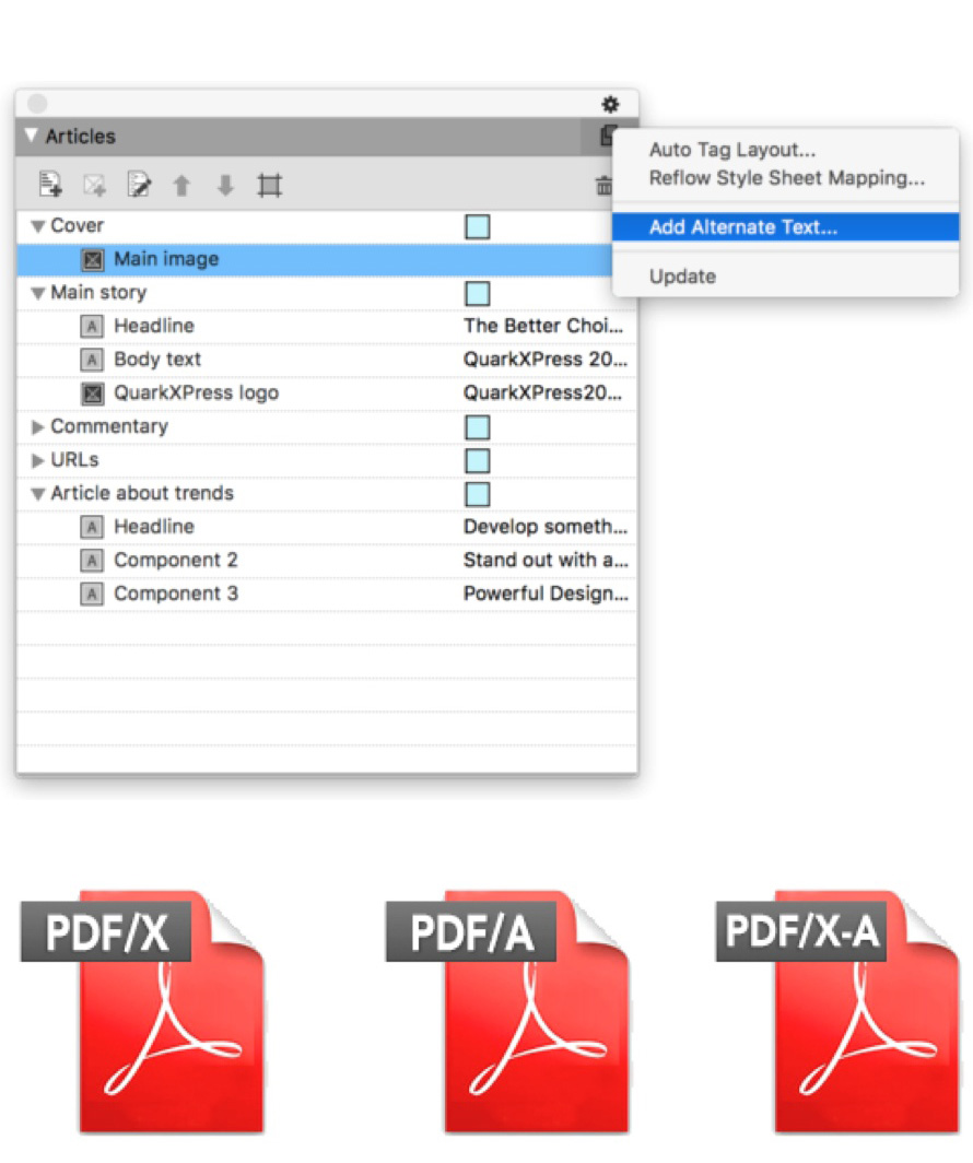 Darüber hinaus können Anwender von QuarkXPress 2018 mit der pdfToolbox Technologie eine einzige PDF-Datei erstellen, die sowohl PDF/X-4 als auch PDF/A-2 kompatibel ist. PDF/A ist der ISO-Standard für die Langzeitarchivierung. PDF/X-4 ist der ISO-Standard für den Austausch von druckbaren PDF-Dateien. Darüber hinaus kann der Anwender mit QuarkXPress 2018 die erzeugte PDF-Datei ‚taggen‘, also mit internen Angaben zur inhaltlichen Struktur und korrekten Lesereihenfolge des Inhaltes anreichern. Letzteres ist Voraussetzung, damit PDF-Dateien barrierefrei sind. Das heißt für Anwender, dass sie nur eine PDF-Datei erzeugen und vorhalten müssen, die druckfähig, barrierefrei und gleichzeitig langzeitarchivierbar ist. PDF-basierte Workflows werden damit deutlich einfacher.