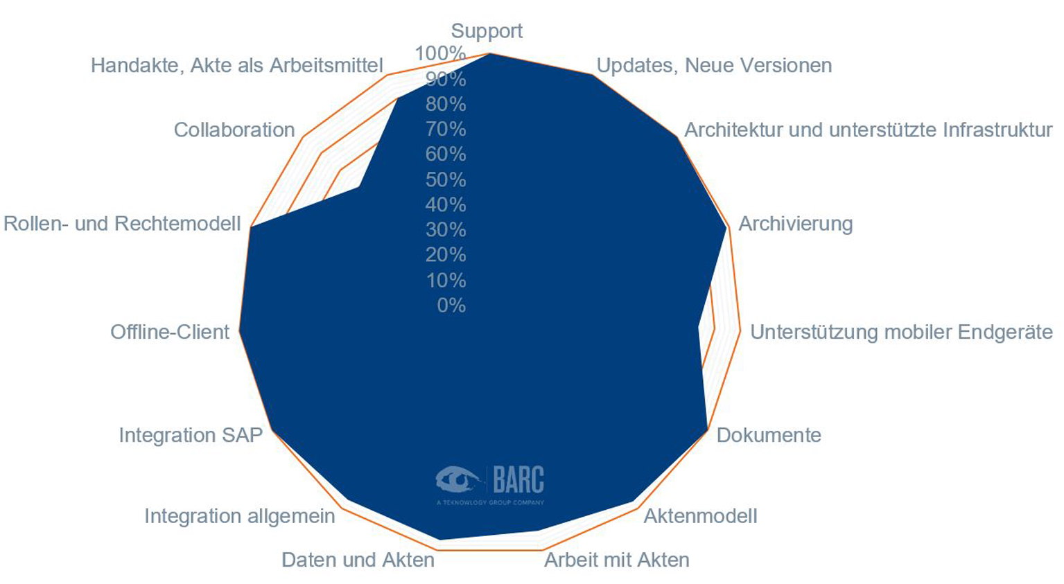 windream erzielte in der BARC-Studie zur E-Akte insgesamt über 1.500 Punkte, die sich aus der Bewertung einer Vielzahl von Testkriterien ergab. Eine „100-Prozent-Bewertung“ gab es für die windream-Lösung zur Aktenverwaltung in insgesamt sieben Kategorien: Support, Updates, Architektur, Dokumente, Integration SAP, Offline-Client sowie Rollen- und Rechtemodell. In weiteren fünf Disziplinen wurde das Maximalergebnis nur ganz knapp verfehlt, teilweise lag es aber dennoch vor dem Ergebnis der Wettbewerber. Insgesamt wurden die Lösungen der anderen Teilnehmer im Rahmen der BARC-Beurteilung mit deutlichem Abstand geschlagen.