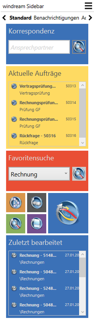 Generell bietet die neue Sidebar windream-Anwendern und Administratoren die Möglichkeit, weitere ECM-Funktionen zu integrieren und sie an die Anforderungen ihres Unternehmens anzupassen. Auch dadurch ergibt sich ein deutlicher Mehrwert, denn häufig benötigte und typische ECM- bzw. BPM-Aufgaben befinden sich mit der neuen windream Sidebar immer im direkten Zugriff auf dem Desktop eines beliebigen windream Arbeitsplatzrechners. Im Lieferumfang der Sidebar sind bereits fertig konfigurierte Kacheln enthalten, über die die einzelnen Funktionen und Anwendungen gestartet werden.